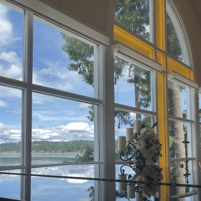 The sanctuary is the perfect place to sit in quiet reflection with beautiful picture windows offering spectacular water views.