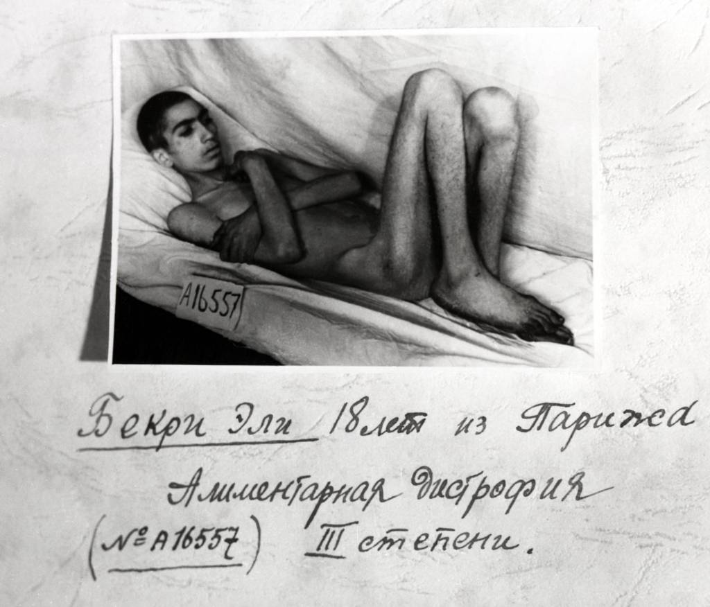 10. This is a card taken from the hospital files produced by Soviet staff after the liberation of the camp. The information about the patient, labeled No. 16557, reads, “Bekrie, Eliu, 18 years, from Paris. alimentary dystrophy, third degree.” (Credit: Galerie Bilderwelt/Getty Images)