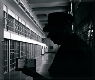 - Officer Jim Lowry looks down Broadway with members of the press waiting for the last group of inmates to walk down Broadway one last time.