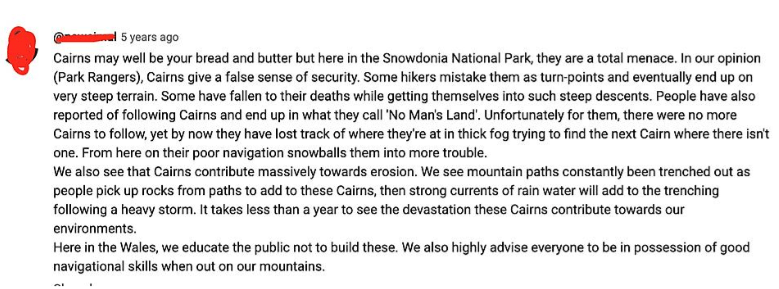 He warns of the dangers of cairns