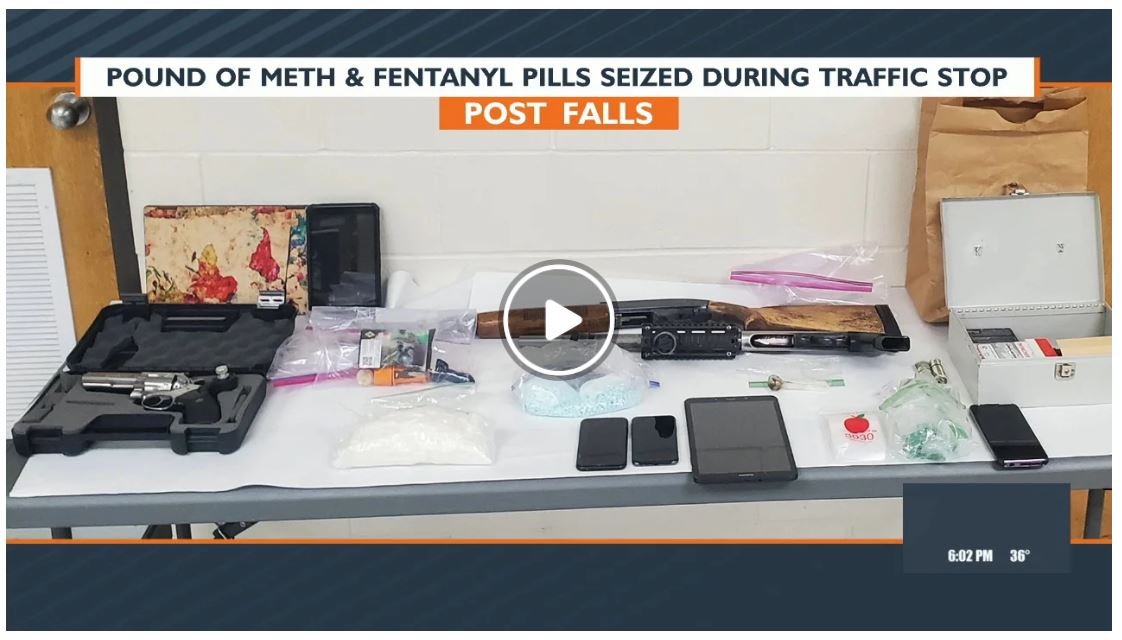 POST FALLS, ID. — Two people were arrested after law enforcement found a pound of methamphetamine, 1,000 fentanyl pills and more during a traffic stop in Post Falls on Tuesday.