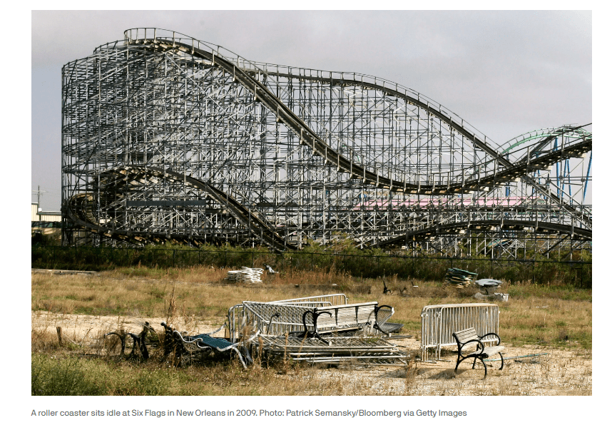- Once part of Jazzland, the rollercoasters visible from Interstate 10 are a reminder of the devastating storm and failed development proposals over the years.