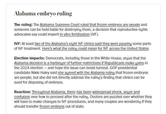 You underwent this process because you wanted to have kids? These embryos arekids now, in the eyes of Alabama law — and God, according to one judge’s concurrence, which is just as important. You could have sworn the reason this embryo was sitting here in vitro was because you wanted it to become a child, but this judge says that it is already just as good as a child. It’s so good, indeed, that protecting it from harm — even the harm that could happen in the complex process of trying to bring it to life in your womb — is worth shutting down every IVF clinic in the state of Alabama. Every subsequent step in the process — testing, implanting — everything that might result in its becoming what you naively thought was something distinct from an embryo, an actual child, must halt. Right now! Lest any harm come to children. The kind of children discernible only to these judges and, peering over their shoulder, God.