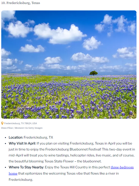 Fredericksburg, Texas is a charming small town with a rich German heritage and a penchant for a little vino. It is the epicenter of the Texas Wine Country with over 60 wineries in the county, 10 of those right around its walkable Main Street. The beautiful Texas Hill Country as it is called, wakes up in the spring with temps in the upper 70s to low 80s, making it pretty much perfect for outdoor activities and wine tours. If you are looking for one of the best cities to visit in April in the USA for wine tours right here in Texas, Fredericksburg is the obvious choice.