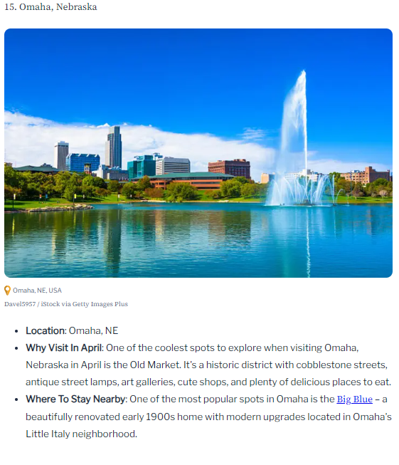 You may not realize it, but Omaha is a fun family-friendly place to visit. In April, look forward to Easter Egg hunts, Earth Day festivities, science festivals, and Arbor Day events. You may want to head to the Lauritzen Gardens for the beautiful blooming daffodils and tulips or go on a wild safari at the Lee G. Simmons Conservation Park. For history buffs or train enthusiasts try checking out the Durham Museum which is located in an old train station. If you enjoy a little hiking, lace up your boots and head to the Fontenelle forest – a 2,000-acre forest with lots of hiking trails, wildflowers to identify, and wildlife to encounter.