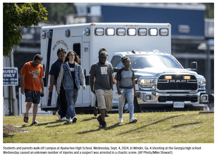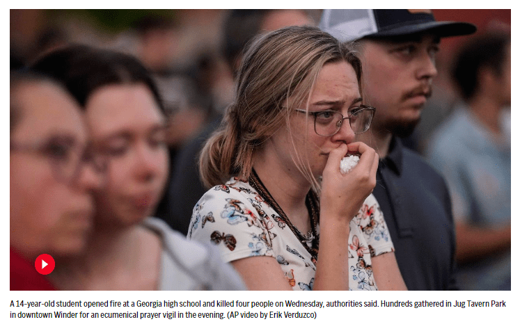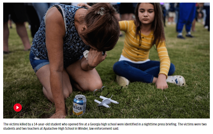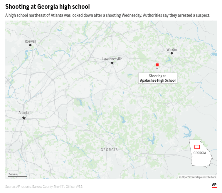 WINDER, Ga. (AP) — A 14-year-old student opened fire at a Georgia high school and killed four people on Wednesday, authorities said, sending students scrambling for shelter in their classrooms — and eventually to the football stadium — as officers swarmed the campus and parents raced to find out if their children were safe.